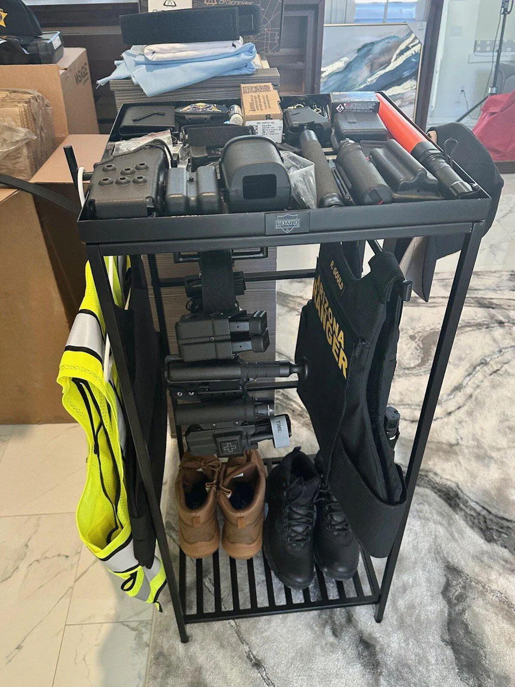 This is the 2nd item i have purchases from Guard the line. Easy processing for payments. Fast shipping in just a few days. Awesome response time via email or on instagram. Quality battle stand for your gear and the more gear i get the more of theses i buy. Its also a conversation piece when i have any guests over. They always ask about it and i get compliments on how organized my equipment is kept. The product just simply works well, is useful, and is a good looking addition to my man cave, garage, or office. Theses are perfect end tables to your home office desk. Thank you again to Guard line for this shopping experience. Im am very happy with my purchase. - Rob